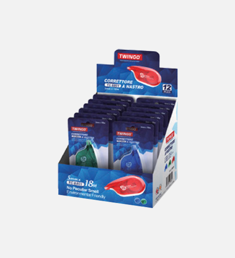 Correttore a nastro 5MMX6MT TWINGO NIKOFFICE in blister, il correttore a nastro è disponibile in colori assortiti. La confezione contiene 12 pezzi.